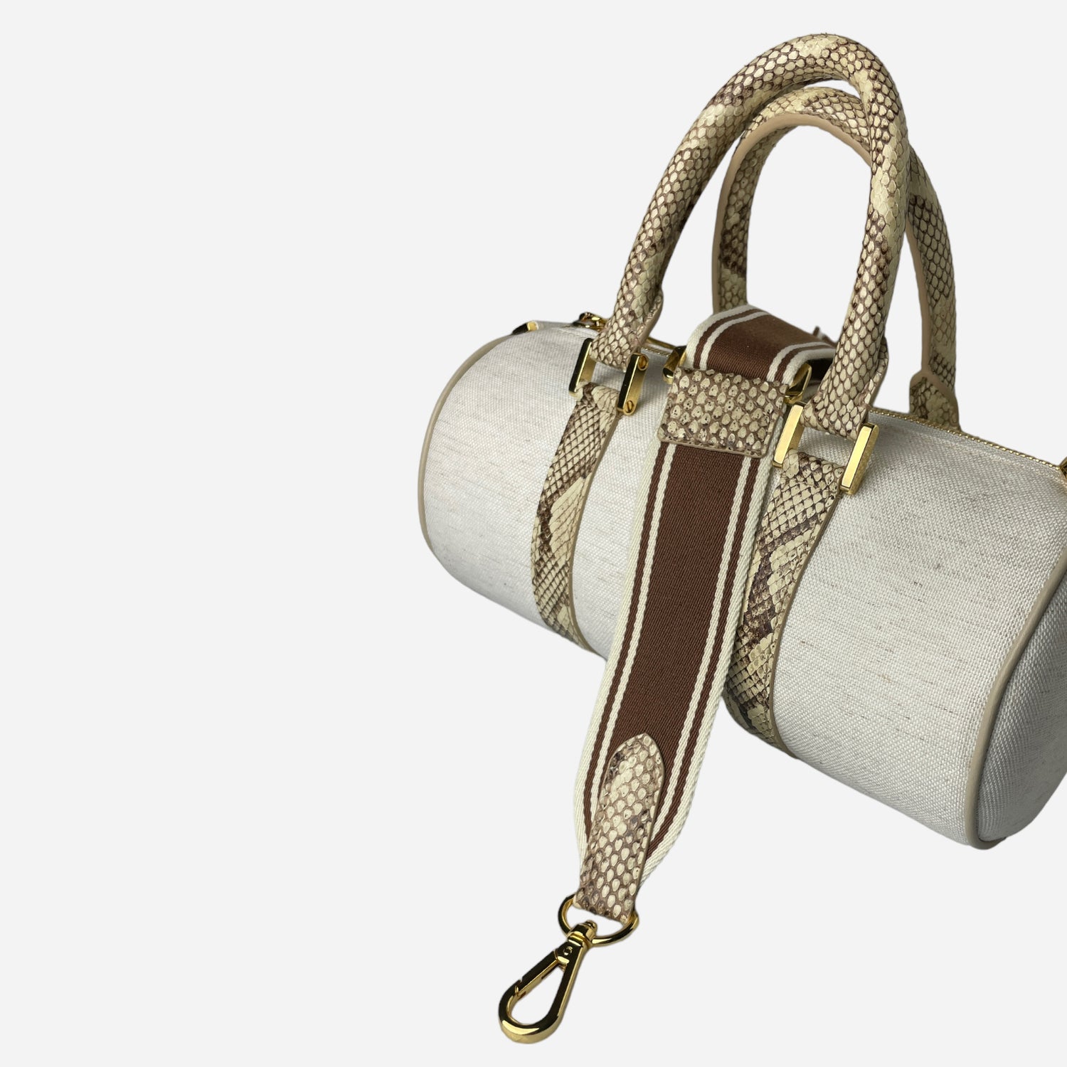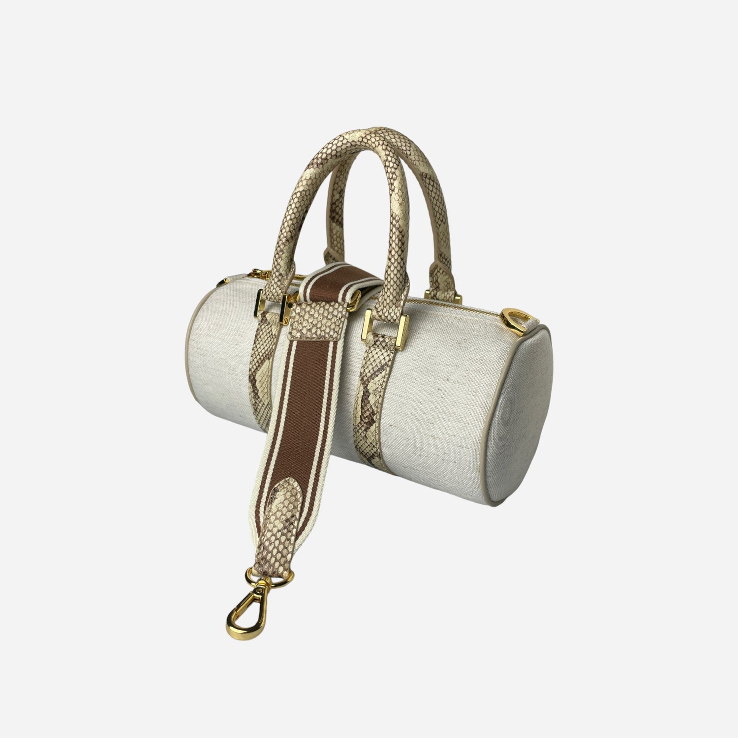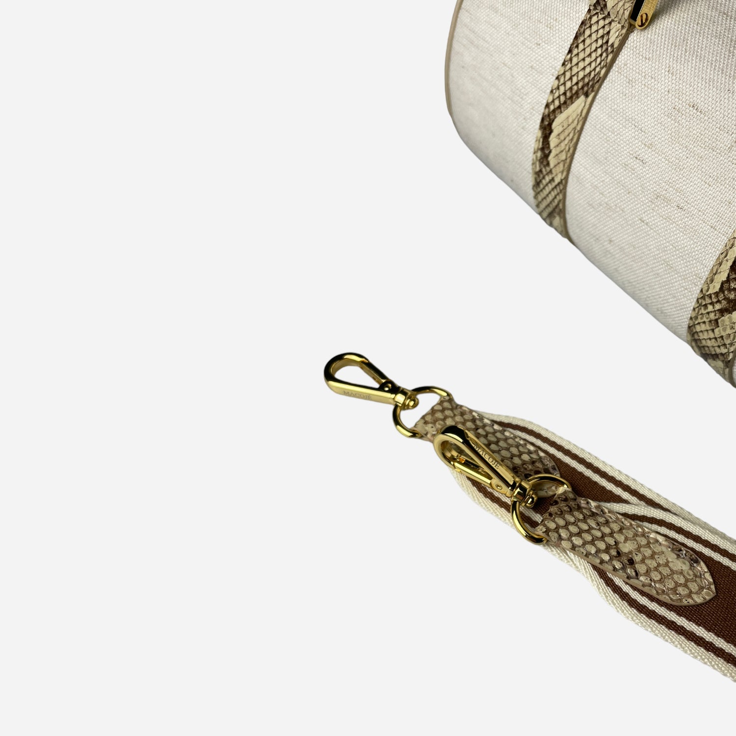 The 23cm "Barrel" Bag from MACOJÉ is the perfect addition to our own travel bag. It's characterized by an off-white colored linen fabric and is complemented with python leather accents to give it a luxurious touch. It interprets the ancient greece architecture through it's color scheme. The entire design is rounded off by golden metal fittings and the iconic "MACOJÉ" lettering on the inside. The bag is lined with beige Alcantara and comes with a shoulder strap in a brown and white pattern.